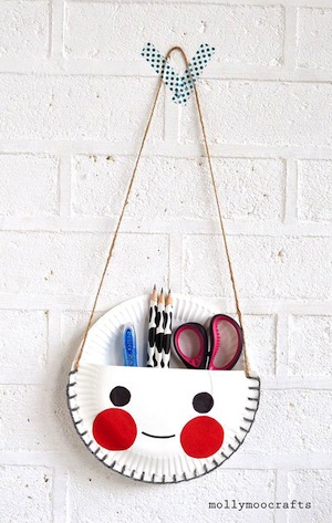 Esta idea además de bonita es bien práctica. Si no sabes en donde guardar esos bolígrafos y lápices que siempre andan por todas partes, tienes una pequeña cesta de almacenaje para sus cosas con dos platos y un poco de lana cosida. Incluso han hecho que sea un accesorio para colgar.