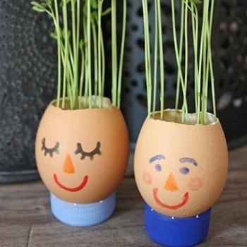 Esta manualidad es muy ecológica. Consiste en coger dos cáscaras de huevo rotas por la parte superior, limpiarlas bien con agua y plantarles dentro unas semillas, por ejemplo de perejil. Ya solamente hará falta poner la tierra y regarla para esperar a que crezca la planta. Y, para que los huevos sean más simpáticos, ¿por qué no dibujarles unas caras?