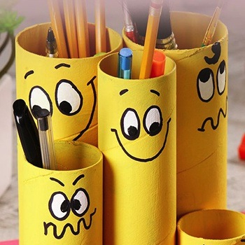 Tan simple como coger rollos de papel higiénico o de cocina y pegarles en la parte inferior un trozo de cartón en forma redondeada para que sirva de base del lapicero. Y ahora viene la parte divertida de la manualidad: pintar los lapiceros de colores y dibujarles caras con distintas expresiones.